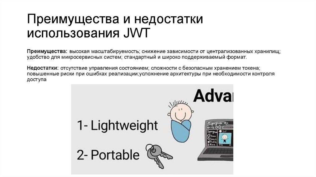 Недостатки: отсутствие управления состоянием; сложности с безопасным хранением токена;