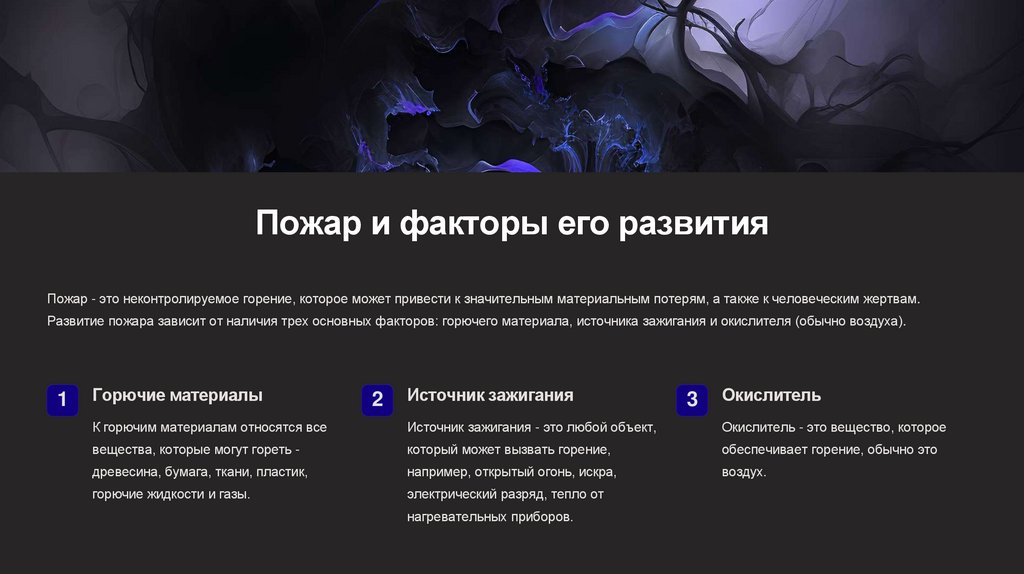 Пожар и факторы его развитияПожар - это неконтролируемое горение, которое может привести к значительным материальным потерям, а также к человеческим жертвам.