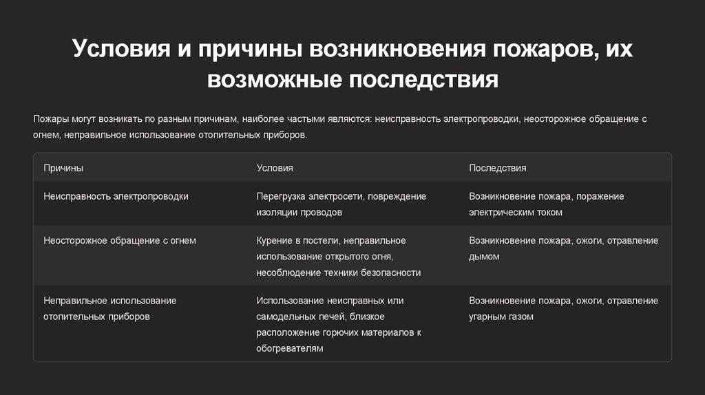 Условия и причины возникновения пожаров, ихвозможные последствия