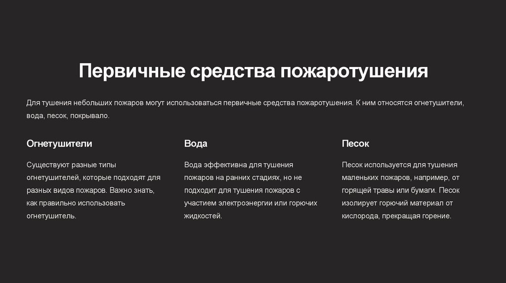 Первичные средства пожаротушенияДля тушения небольших пожаров могут использоваться первичные средства пожаротушения. К ним относятся огнетушители,
