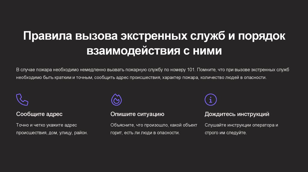 В случае пожара необходимо немедленно вызвать пожарную службу по номеру 101. Помните, что при вызове экстренных служб