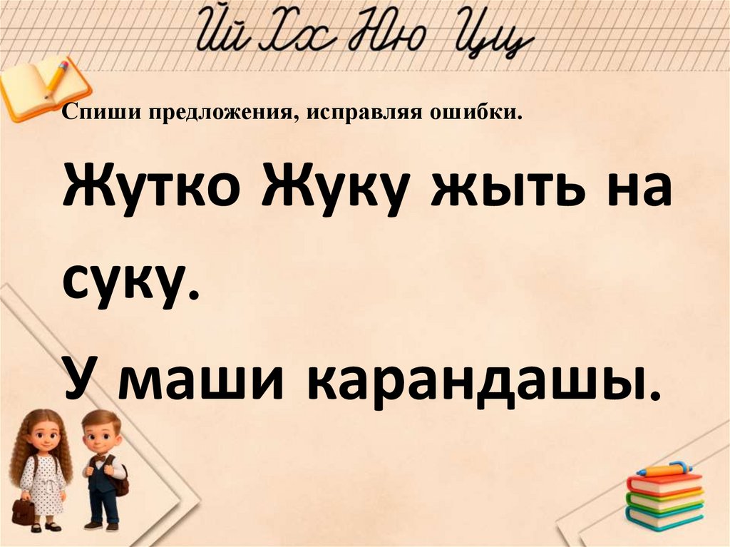 Спиши предложения, исправляя ошибки.Жутко Жуку жыть на