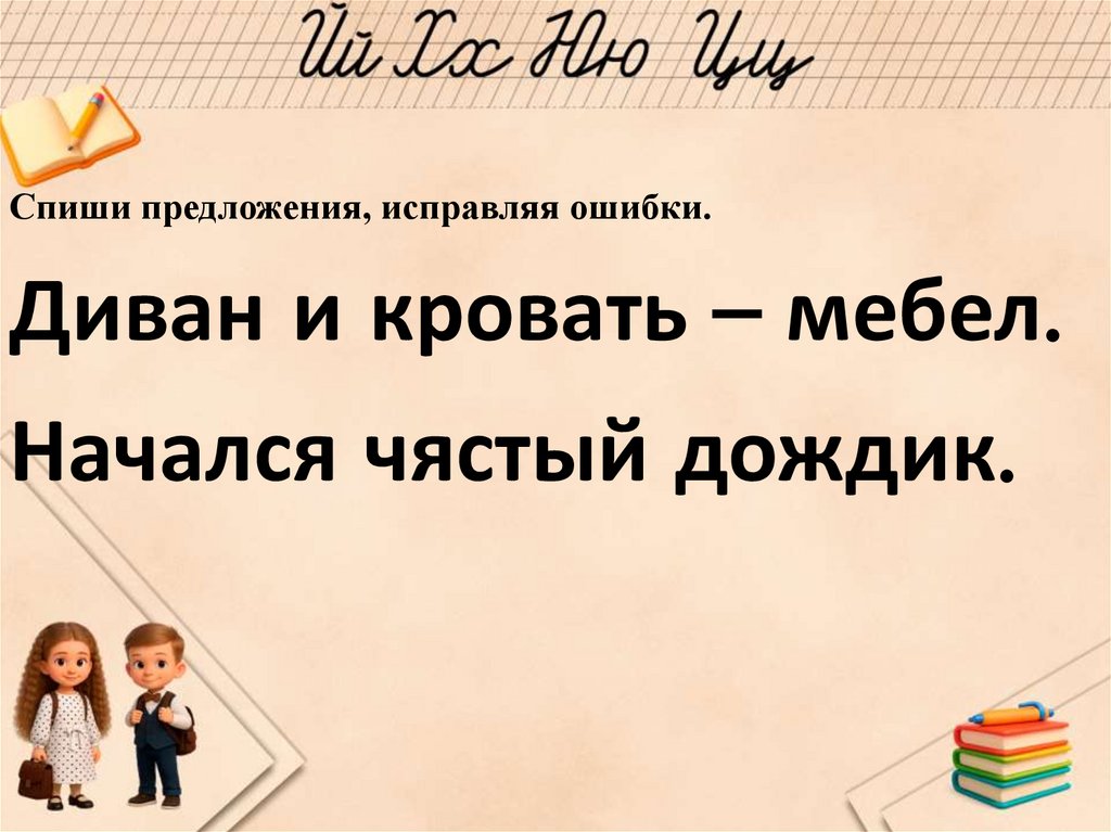 Спиши предложения, исправляя ошибки.Диван и кровать – мебел.