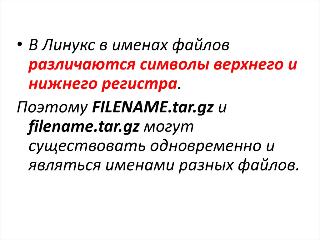 • Имена файлов в Linux могут иметь длину до 255символов и состоять из любых символов, кроме