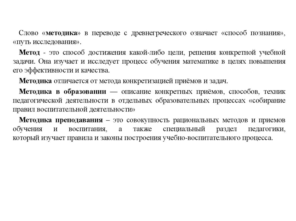 Слово «методика» в переводе с древнегреческого означает «способ познания»,«путь исследования».