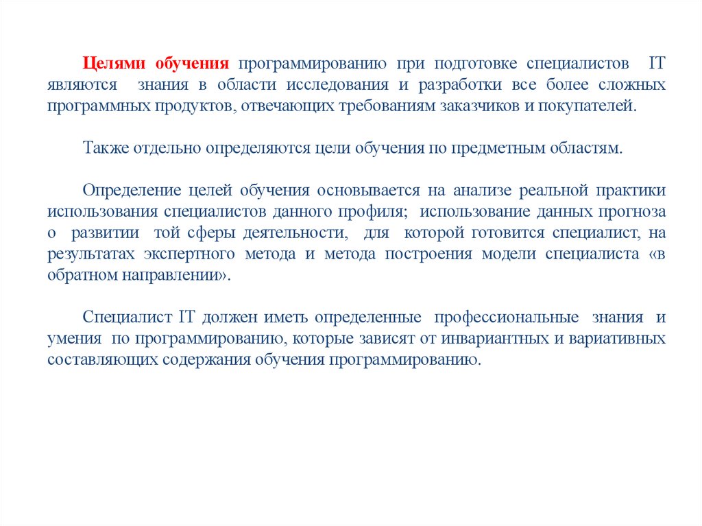 Целями обучения программированию при подготовке специалистов ІТявляются знания в области исследования и разработки все более сложных