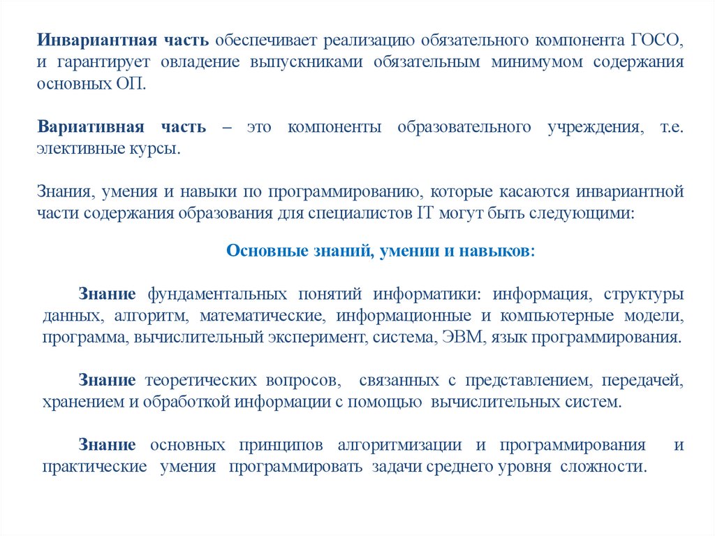 Знания, умения и навыки по программированию, которые касаются инвариантной