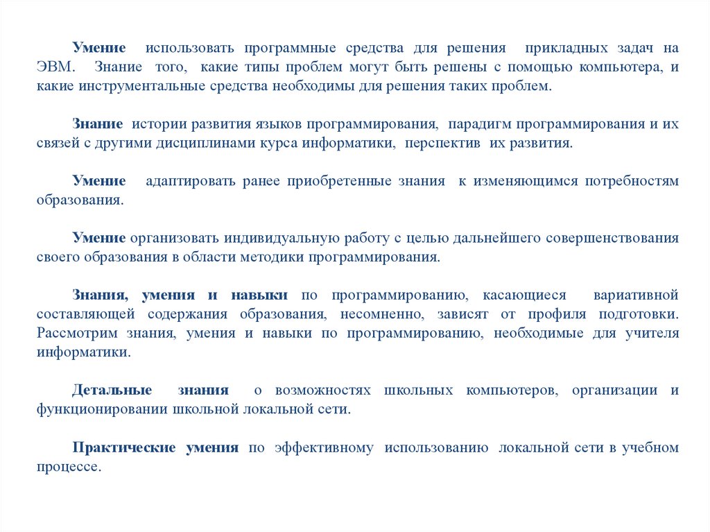 Рассмотрим знания, умения и навыки по программированию, необходимые для учителя