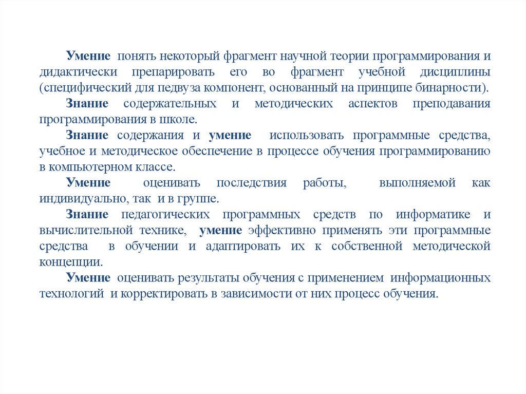 Умение понять некоторый фрагмент научной теории программирования идидактически препарировать его во фрагмент учебной дисциплины