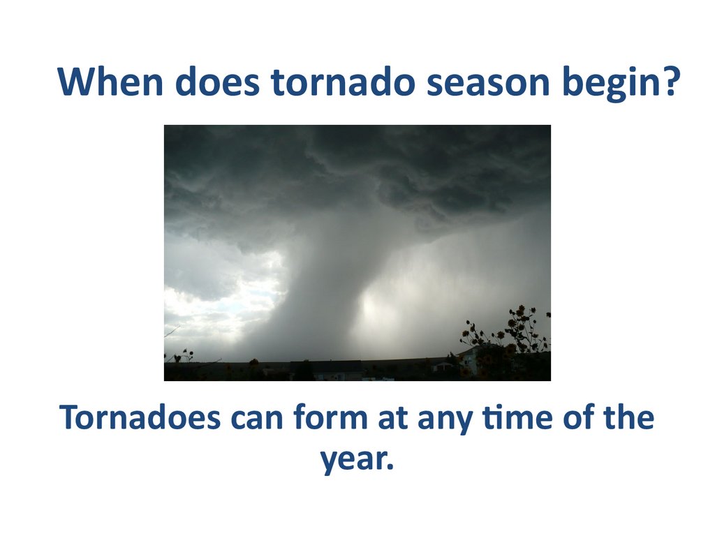 When does tornado season begin?Tornadoes can form at any time of the