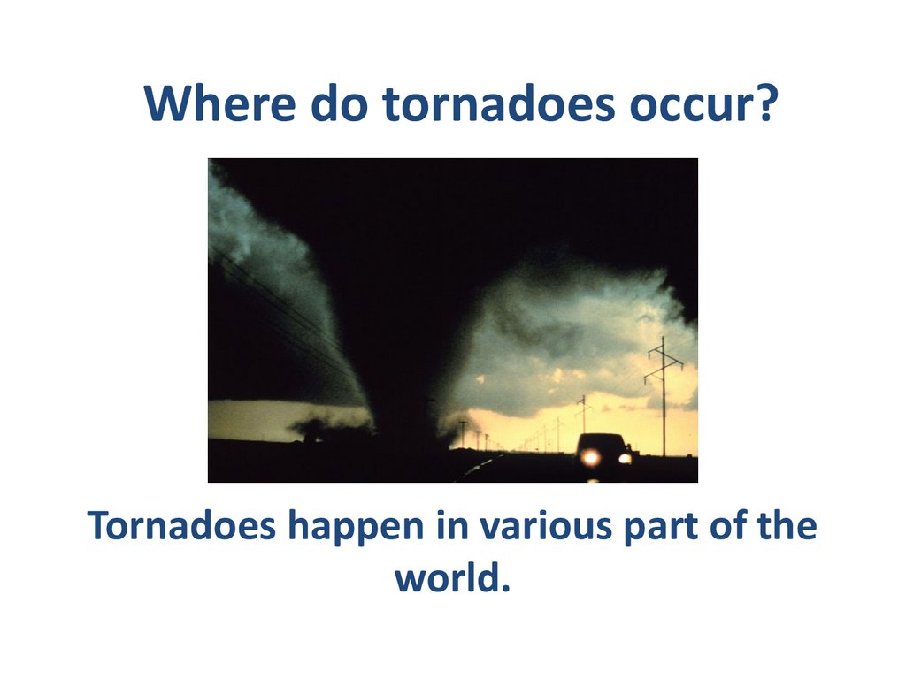 Where do tornadoes occur?Tornadoes happen in various part of the