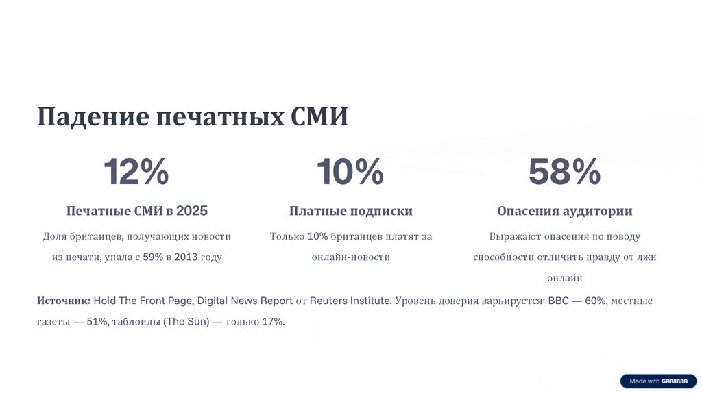 Источник: Hold The Front Page, Digital News Report от Reuters Institute. Уровень доверия варьируется: BBC — 60%, местные