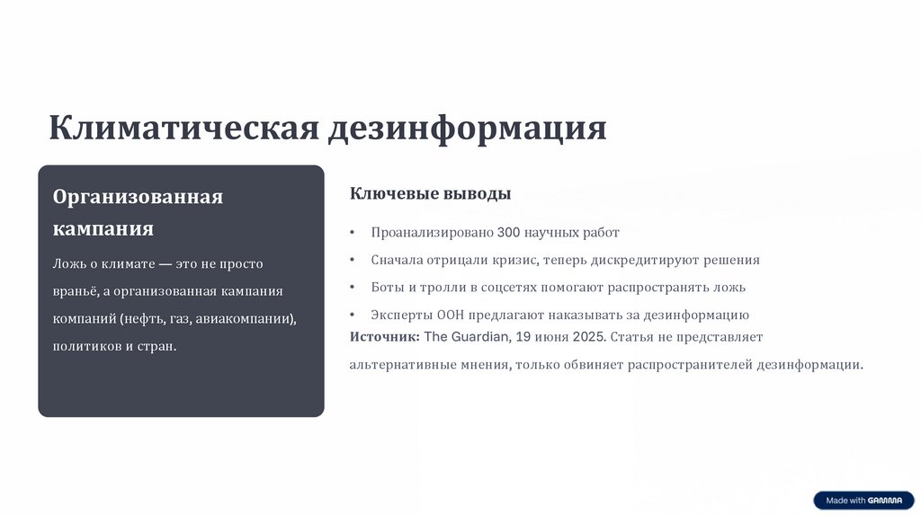 альтернативные мнения, только обвиняет распространителей дезинформации.