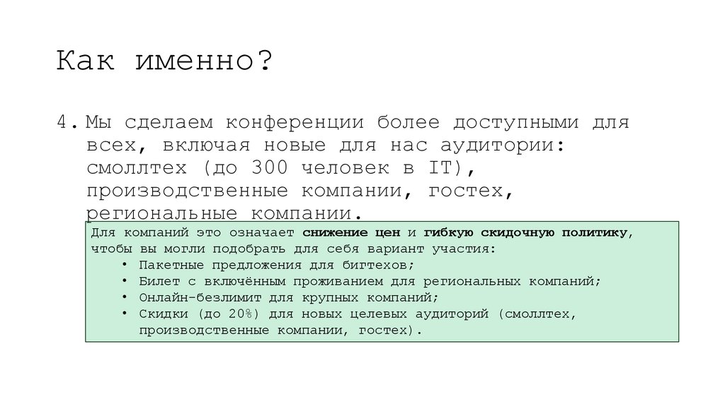 • Скидки (до 20%) для новых целевых аудиторий (смоллтех,