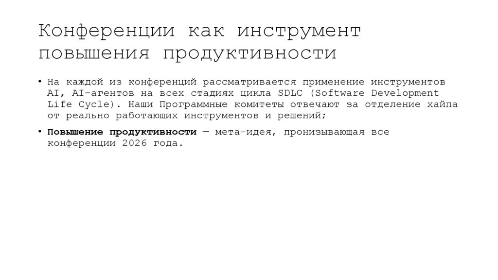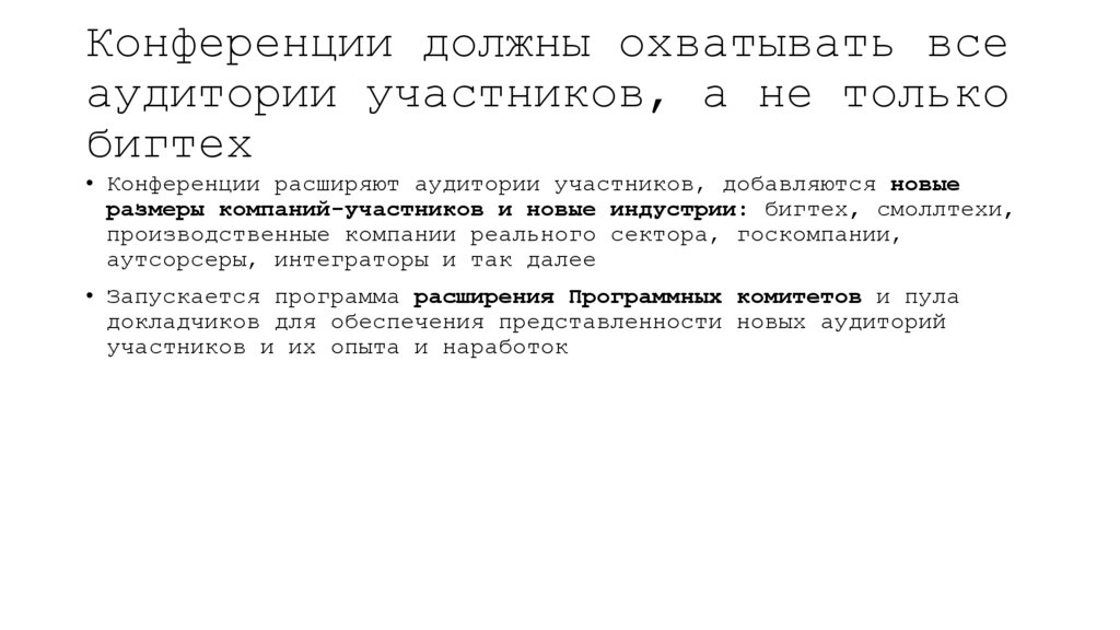 • Программы конференций сфокусированы на бигтехах, интересы и запросы