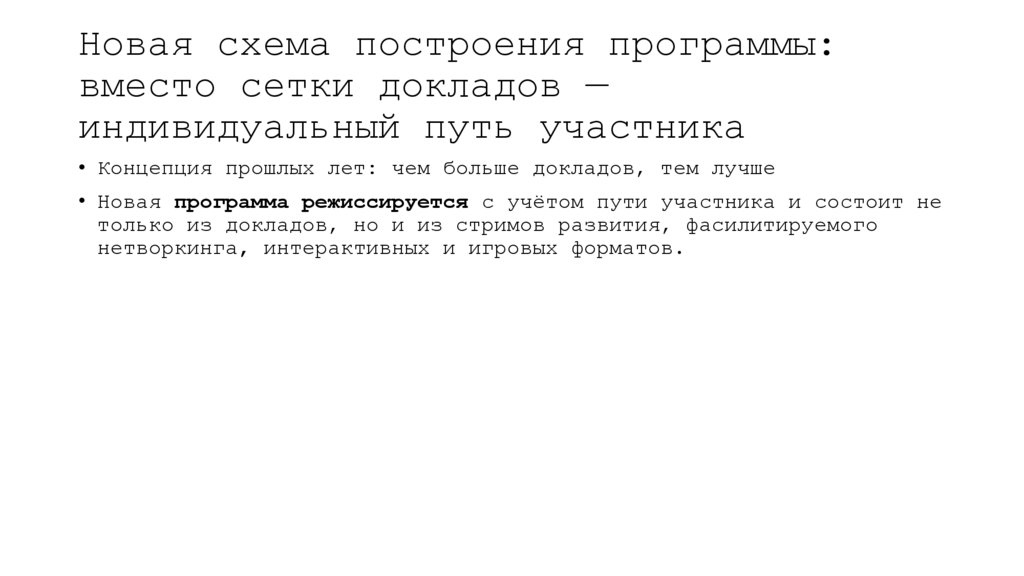 • Концепция прошлых лет: чем больше докладов, тем лучше