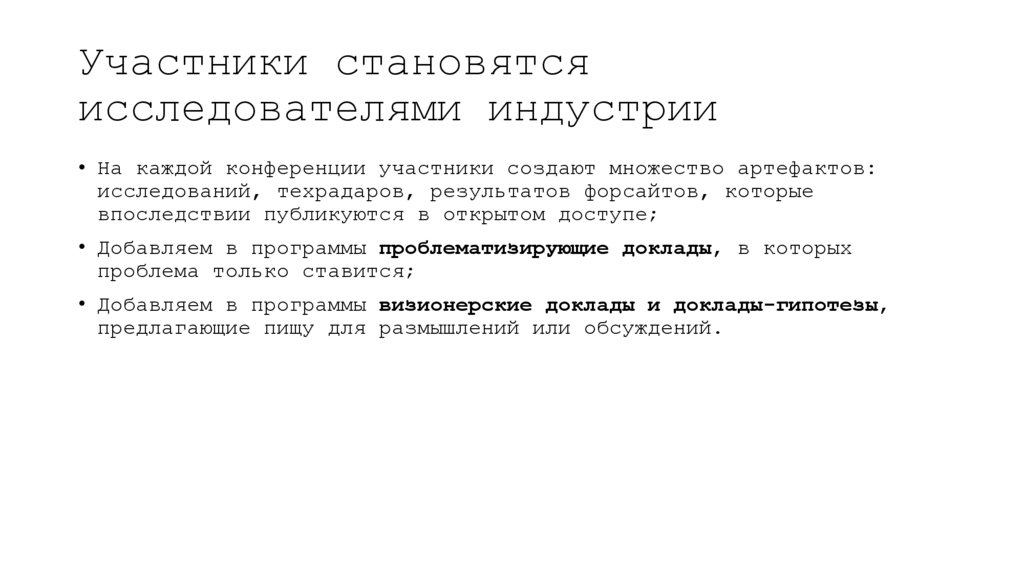 • Добавляем в программы визионерские доклады и доклады-гипотезы,