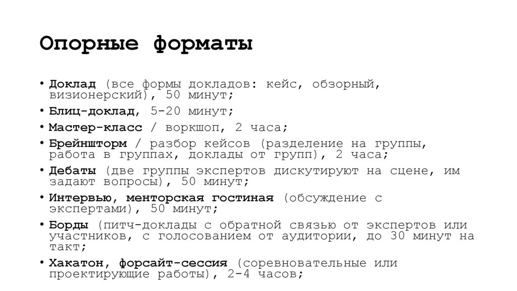 Опорные форматы• Доклад (все формы докладов: кейс, обзорный,