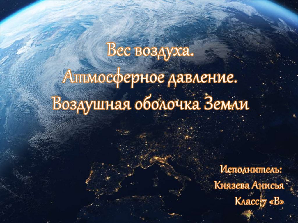 Атмосферное давление - это сила, с которойвоздух давит на поверхность Земли и все предметы, находящиеся на ней.