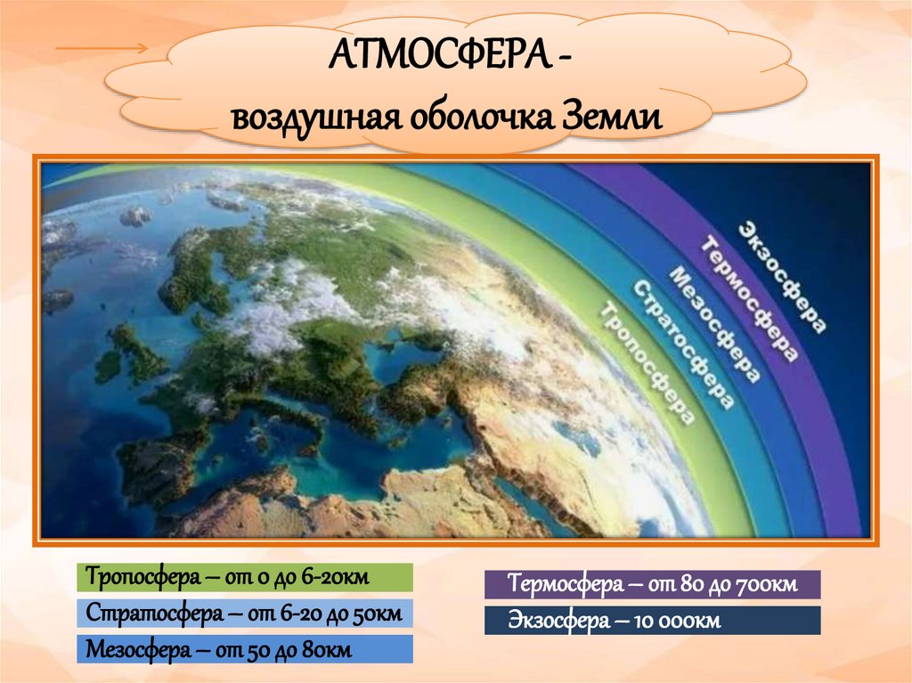 АТМОСФЕРА воздушная оболочка ЗемлиТропосфера – от 0 до 6-20км