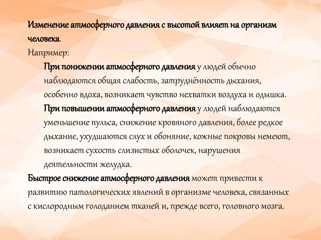 Изменение атмосферного давления с высотой влияет на организмчеловека.