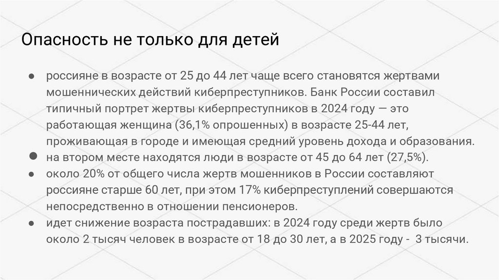 Опасность не только для детей● россияне в возрасте от 25 до 44 лет чаще всего становятся жертвами