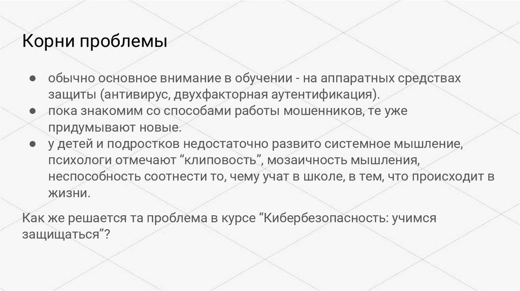 Корни проблемы● обычно основное внимание в обучении - на аппаратных средствах