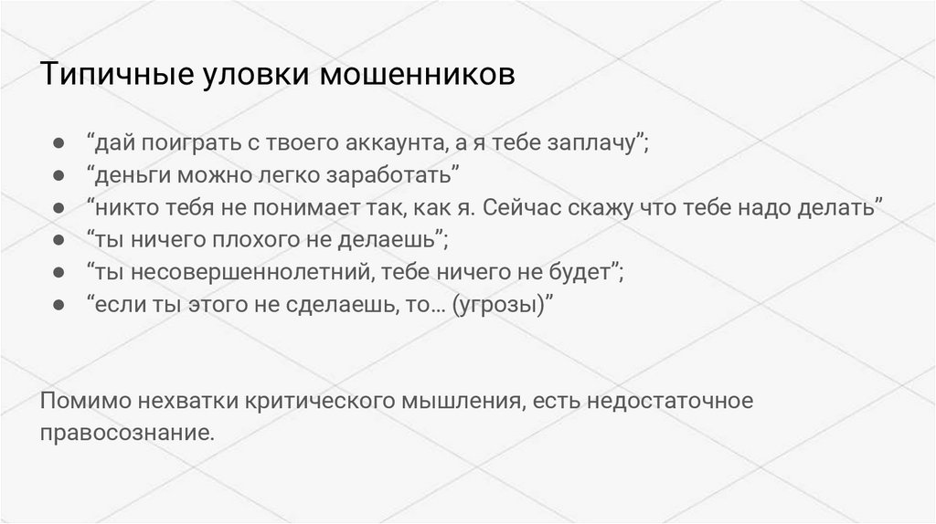 Типичные уловки мошенников“дай поиграть с твоего аккаунта, а я тебе заплачу”;