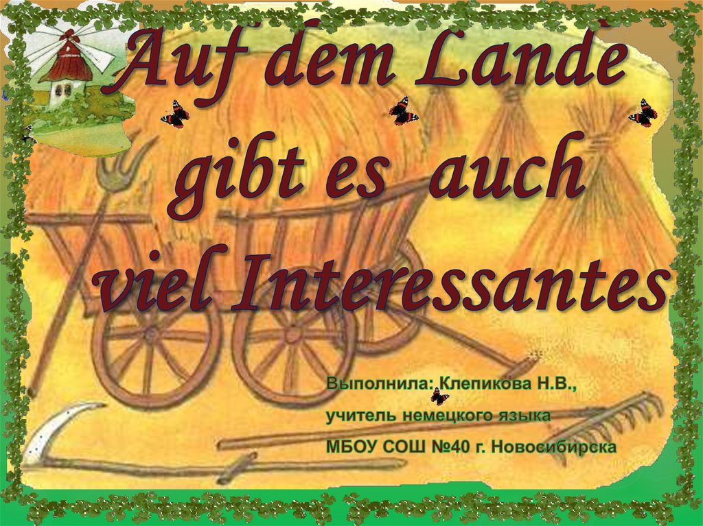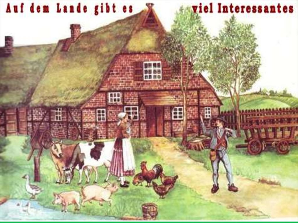 Hier ist ein großer Bauernhof. Im Haus wohnt eine Familie.Die Bauern züchten Kühe, Schweine, Schafe. Im Hof steht