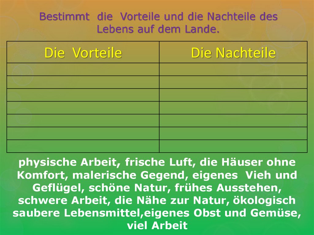Bestimmt die Vorteile und die Nachteile desLebens auf dem Lande.