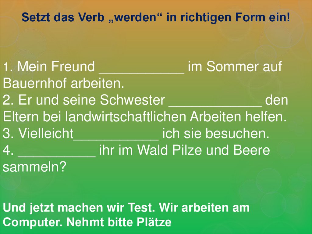 Setzt das Verb „werden“ in richtigen Form ein!1. Mein Freund ___________ im Sommer auf