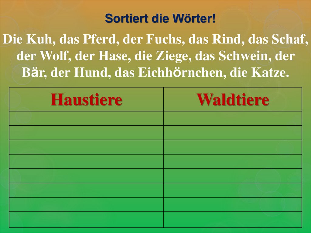 Sortiert die Wörter!Die Kuh, das Pferd, der Fuchs, das Rind, das Schaf,
