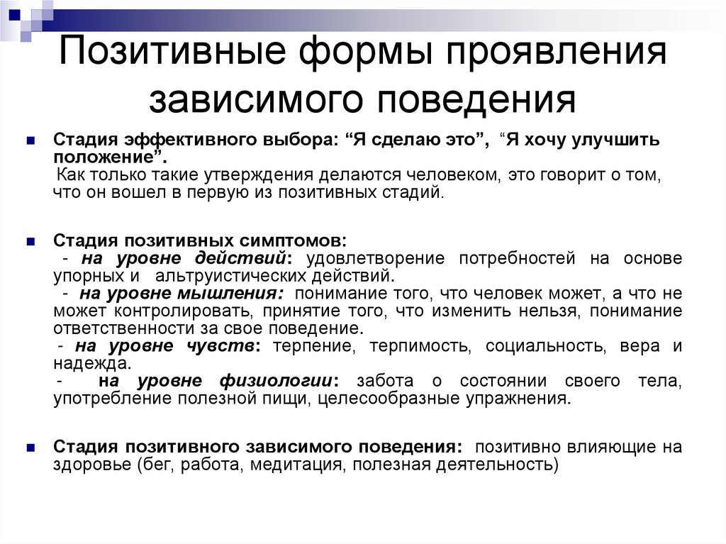 Стадия позитивного зависимого поведения: позитивно влияющие на