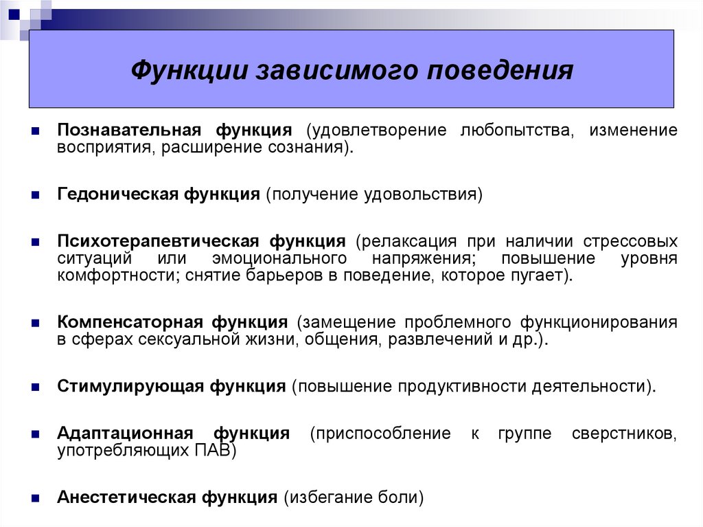 Функции зависимого поведенияПознавательная функция (удовлетворение любопытства, изменение