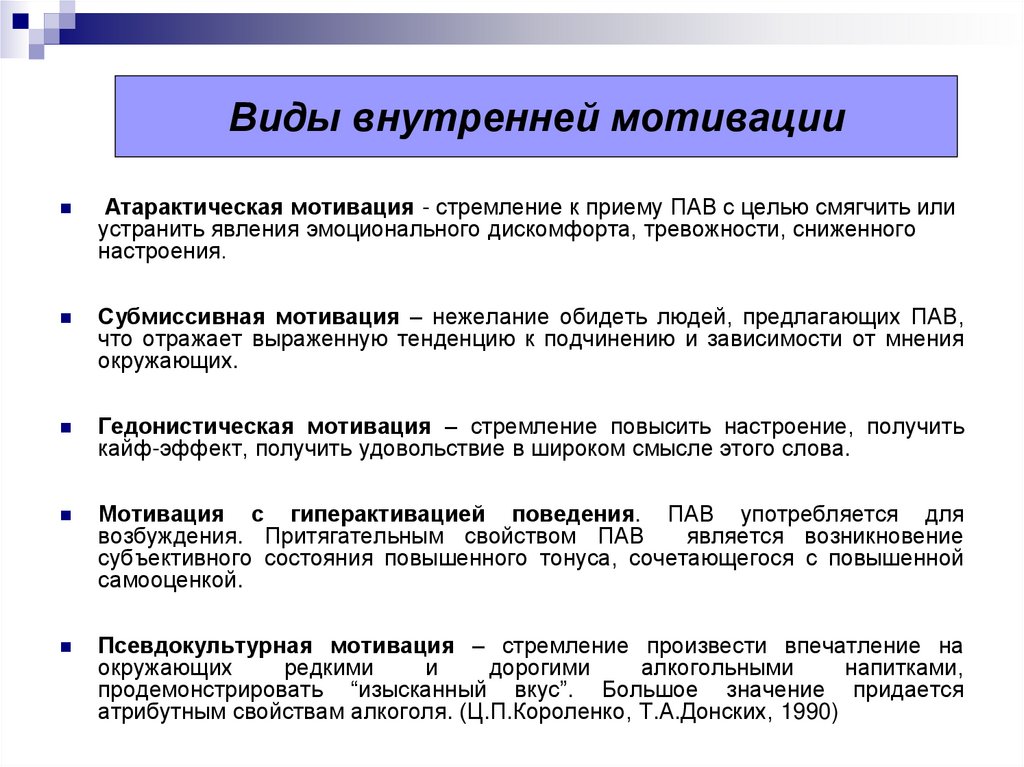 Виды внутренней мотивацииАтарактическая мотивация - стремление к приему ПАВ с целью смягчить или