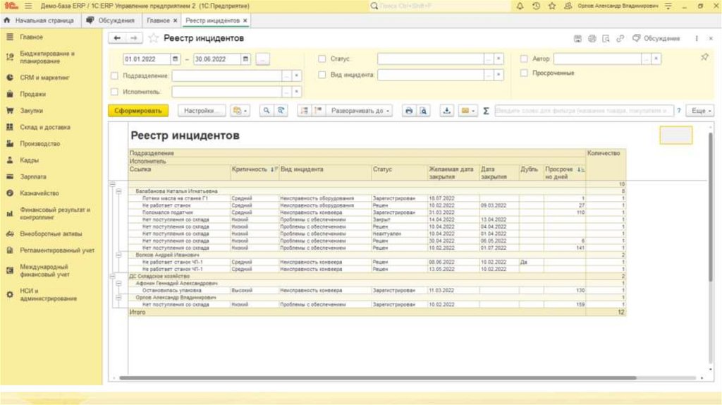 из раздела “Главное” –> “Почта, задачи, инциденты” вызвав рабочее место по управлению инцидентами “Инциденты”;