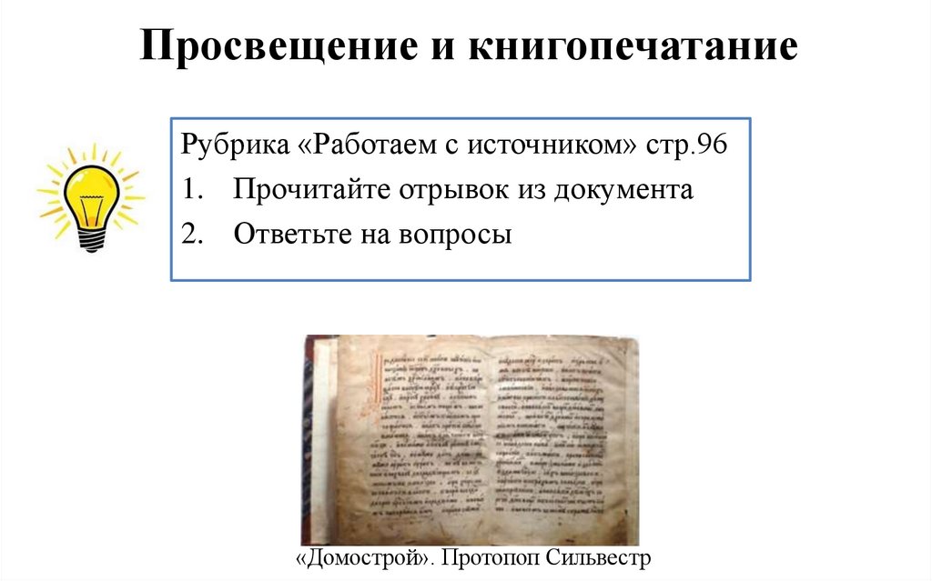 Просвещение и книгопечатаниеРубрика «Работаем с источником» стр.96