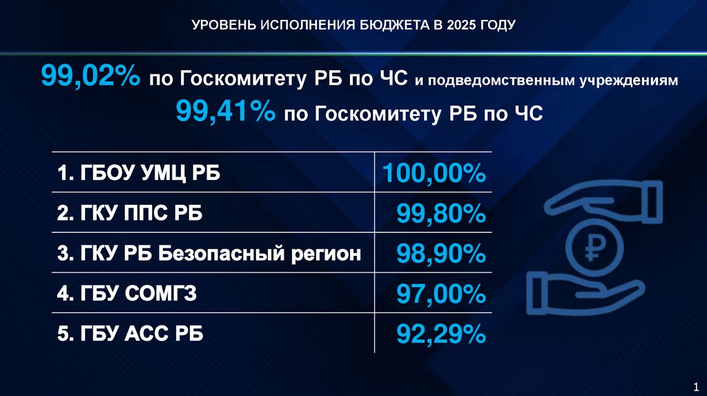 УРОВЕНЬ ИСПОЛНЕНИЯ БЮДЖЕТА В 2025 ГОДУ99,02% по Госкомитету РБ по ЧС и подведомственным учреждениям