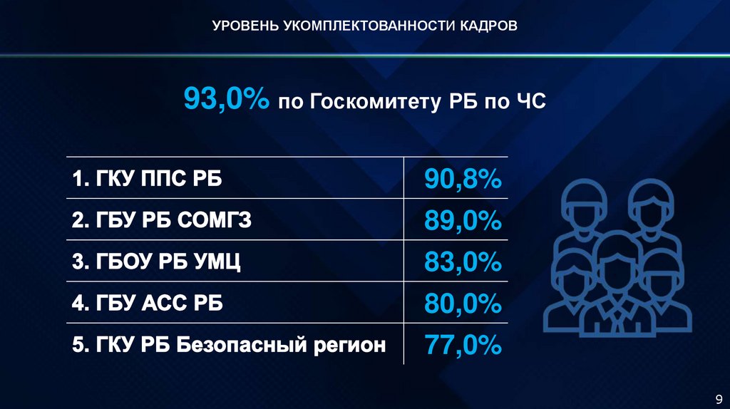 УРОВЕНЬ УКОМПЛЕКТОВАННОСТИ КАДРОВ93,0% по Госкомитету РБ по ЧС