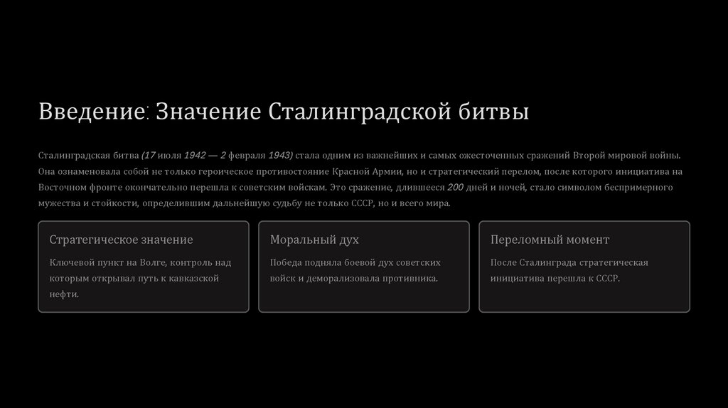 Введение: Значение Сталинградской битвыСталинградская битва (17 июля 1942 — 2 февраля 1943) стала одним из важнейших и самых ожесточенных сражений Второй мировой войны.