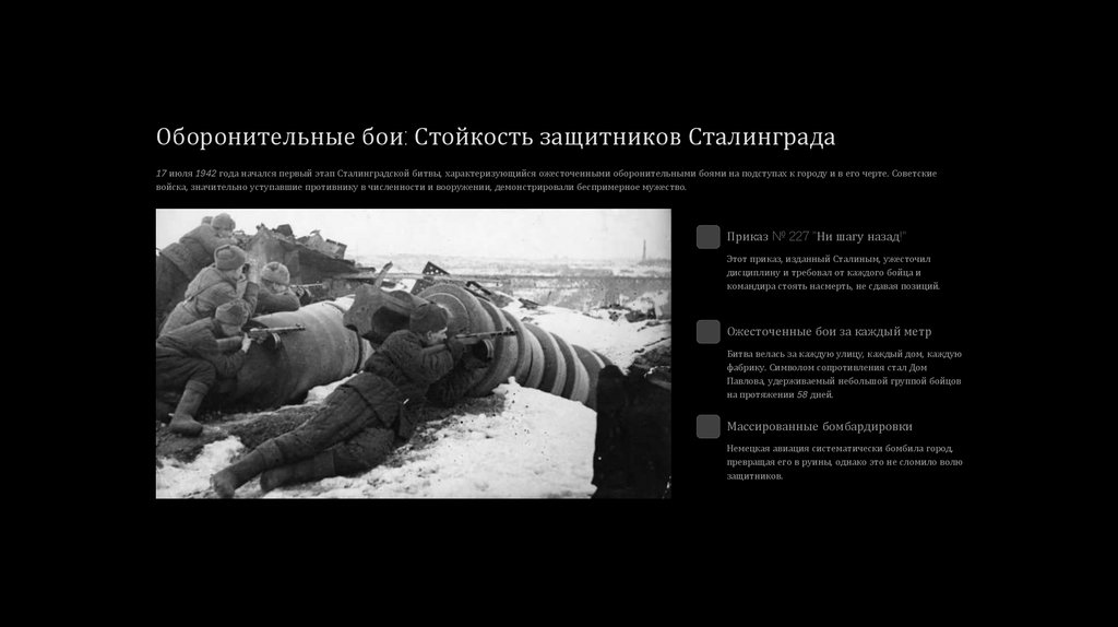 Оборонительные бои: Стойкость защитников Сталинграда17 июля 1942 года начался первый этап Сталинградской битвы, характеризующийся ожесточенными оборонительными боями на подступах к городу и в его черте. Советские