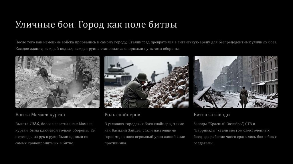 Уличные бои: Город как поле битвыПосле того как немецкие войска прорвались к самому городу, Сталинград превратился в гигантскую арену для беспрецедентных уличных боев.