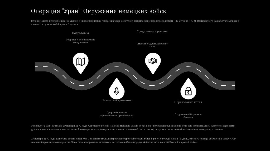 Операция "Уран": Окружение немецких войскВ то время как немецкие войска увязли в кровопролитных городских боях, советское командование под руководством Г. К. Жукова и А. М. Василевского разработало дерзкий