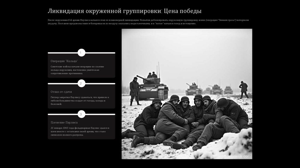 Ликвидация окруженной группировки: Цена победыПосле окружения 6-й армии Паулюса начался этап ее планомерной ликвидации. Попытки деблокировать окруженную группировку извне (операция "Зимняя гроза") потерпели