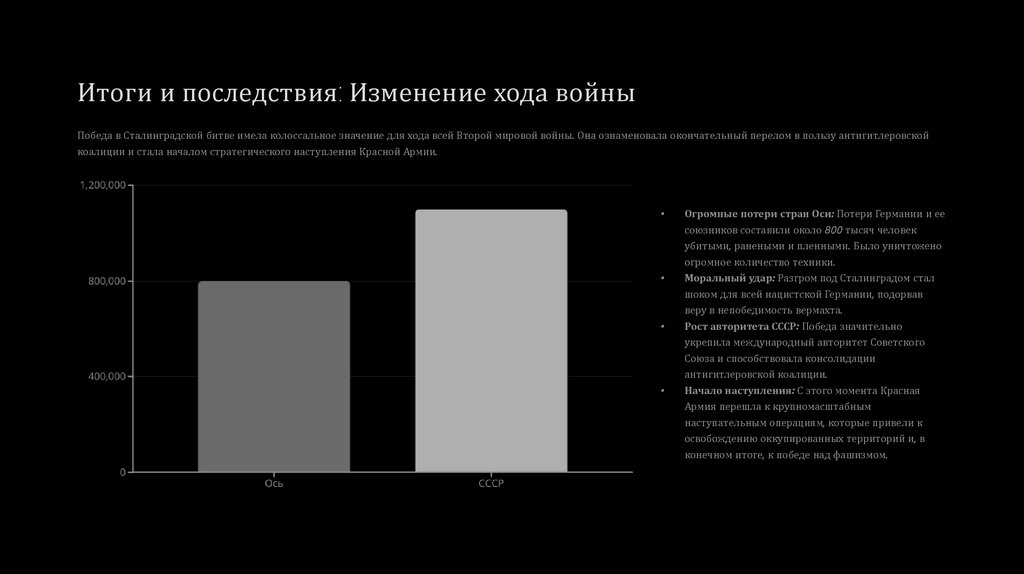 Итоги и последствия: Изменение хода войныПобеда в Сталинградской битве имела колоссальное значение для хода всей Второй мировой войны. Она ознаменовала окончательный перелом в пользу антигитлеровской