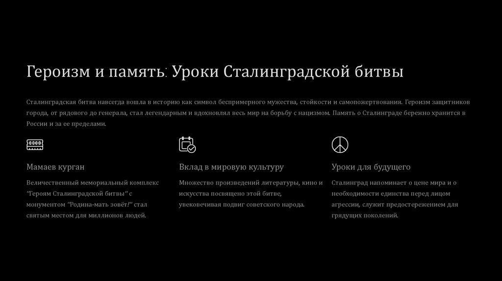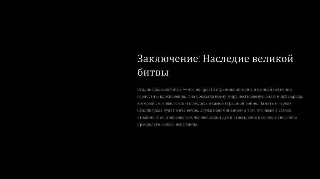 города, от рядового до генерала, стал легендарным и вдохновлял весь мир на борьбу с нацизмом. Память о Сталинграде бережно хранится в