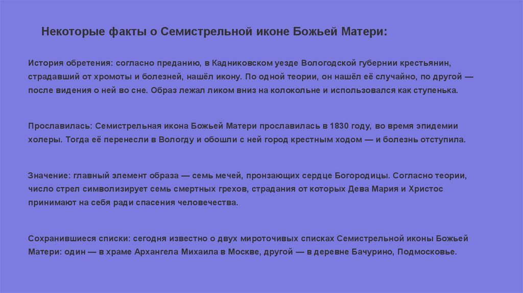 Некоторые факты о Семистрельной иконе Божьей Матери:История обретения: согласно преданию, в Кадниковском уезде Вологодской губернии крестьянин,