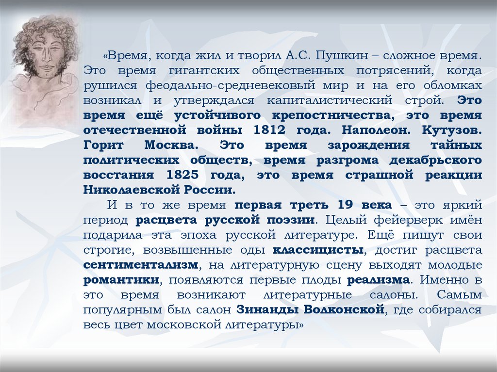 «Время, когда жил и творил А.С. Пушкин – сложное время.Это время гигантских общественных потрясений, когда