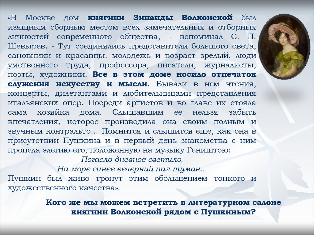 «В Москве дом княгини Зинаиды Волконской былизящным сборным местом всех замечательных и отборных