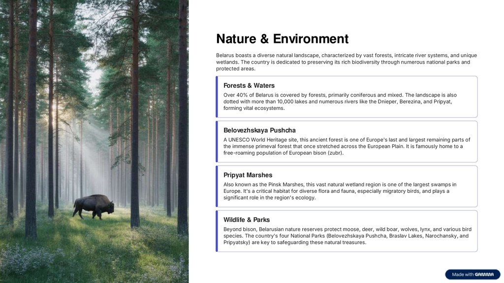 Nature & EnvironmentBelarus boasts a diverse natural landscape, characterized by vast forests, intricate river systems, and unique